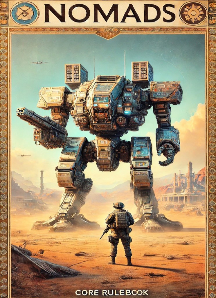 Nomads is a tabletop roleplaying game designed by someone with forty years of gaming experience. It is intended to focus on small squads of giant, piloted, robot combat as well as player character combat and interaction with an endless possibility of galactic adventures for them. There are several gaming systems in existence in the genre but in this designer’s opinion none of them have the total package of cool and easy character generation along with a user-friendly combat system for